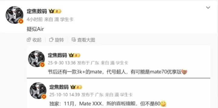 综上,虽然 “高端旗舰 + Air” 的组合最具营销冲击力,但从风险控制、产能调度角度,Mate70 Air 先走一步的可能性不小。